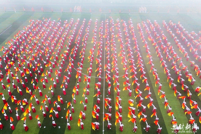 国旗护卫队护送着鲜艳的五星红旗率先步入会场,动作精准、步伐铿锵,尽显威武英姿。紧随其后的各学院运动员方阵,穿戴整齐、步履稳健,青春的脸庞上洋溢着蓬勃朝气。会计学院680名学子献上的大型团体操《舞颂华章》以青春律动演绎古今风采,成为全场焦点。红扇舞动间,阵型时而如长龙腾跃,时而似江河奔流,展现中华文明深厚底蕴;队形变幻模拟政策传导与市场脉动,诠释财经人服务国计民生的专业使命;节奏转换间,数据流动与智能算法造型交替呈现,彰显财经智慧与数字技术的深度融合。此外,活力四射的健美操、动感十足的街舞及飒爽英姿的女子匕首操等表演相继登场,全方位展现了安财学子昂扬奋进的青春风貌。