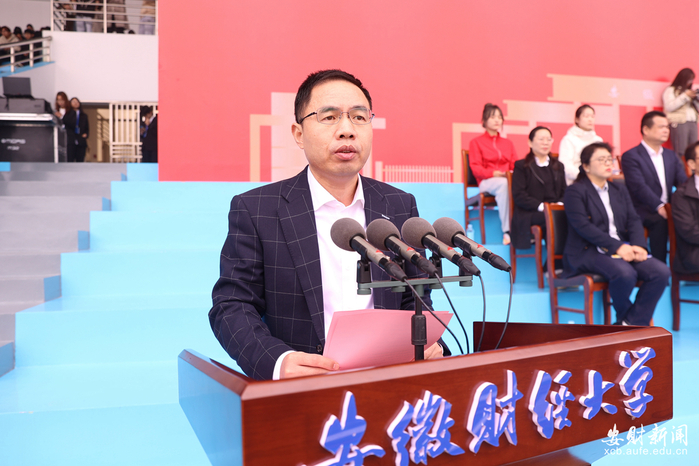 朱红军致开幕辞。他指出,长期以来学校将体育育人置于人才培养突出位置,坚守“健康第一、体教融合、以体育人”教育理念,推动体育设施建设与体育文化发展协同并进,将体育精神深度融入人才培养全过程,有效激发了师生的运动热情,为师生的全面健康发展筑牢基础。他强调,田径运动会作为学校体育教学成果的一次集中展示,也是师生精神风貌的一次全面检阅。运动比赛的意义,远不止于赛场上的胜负,更在于每一次自我超越迸发的生命力、淬炼的坚韧与不言弃,在协作中凝聚的合力与信任,把“我”变成“我们”。朱红军表示,今年是学校“十四五”收官、“十五五”布局的关键之年,希望能以本次运动会为契机,将赛场上的拼搏精神与协作意识转化为推动学校发展的强大动力,奋力谱写建设具有鲜明财经特色的多科性高水平大学新篇章。